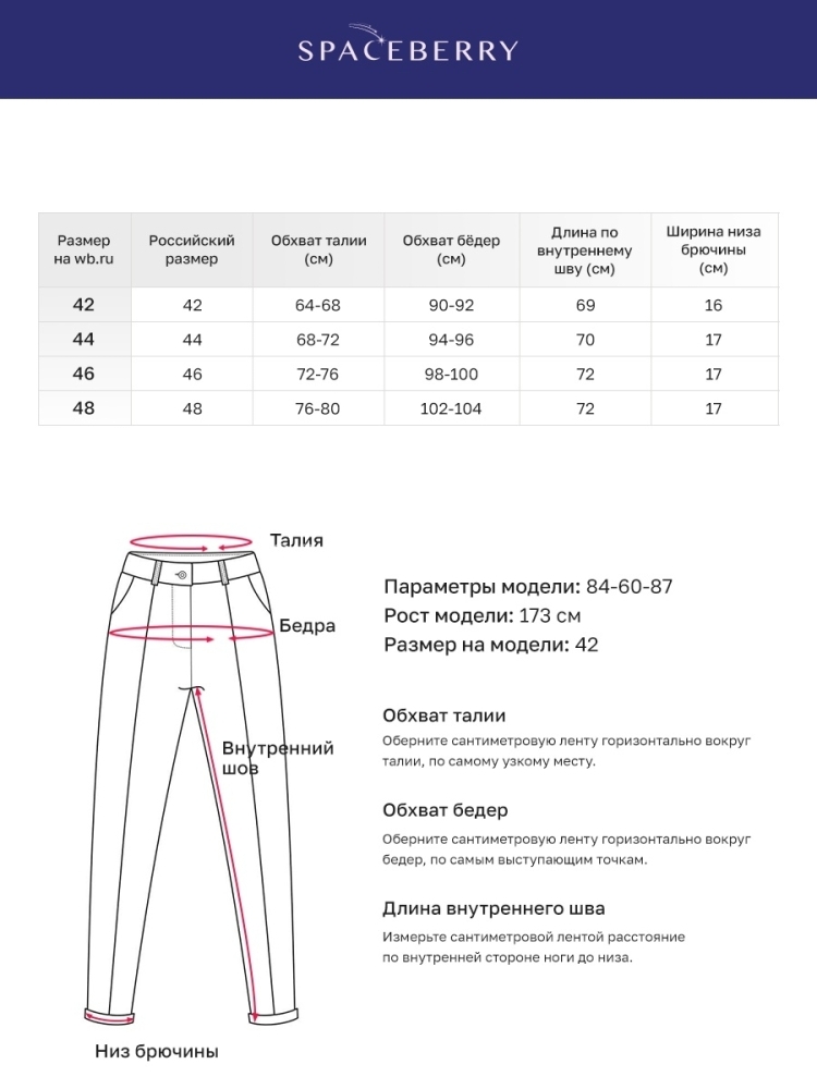 У нас скидки на брюки! Женские классические брюки - идеальный вариант для девушки как для осенней и весенней погоды, так и холодной зимы. Штаны из костюмной ткани бренда Spaceberry на молнии подойдут как для офиса, так и модным подросткам в школу. Оригинальная модель идеально сидит на фигуре любого типа благодаря завышенной линии талии, шлевкам для ремня, а также заутюженным стрелкам, которые визуально стройнят ноги, а материал создаст удобство и комфорт для повседневной носки. Их можно носить как с оверсайз кофточкой, так и с облегающим топом. Такие демисезонные, слегка свободные, брюки чинос, зауженные к низу, станут отличным подарком на новогодние праздники для подруги. Плотный материал приятно прилегает к телу. С такими брюками можно создать стильный комплект с худи или пиджаком с блузкой. Стирать данную модель рекомендуется на режиме деликатной стирки 30 C. Вы можете найти другие модели одежды нашего бренда, кликнув на логотип Spaceberry. Будем рады вашим отзывам!